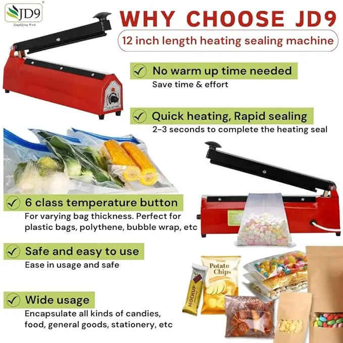 JD9 12&8 Inch Metal Premium Range Heavy Duty Heat Sealer Machine, Impulse Sealer for Plastic Bag, Packing Machine (Red)
